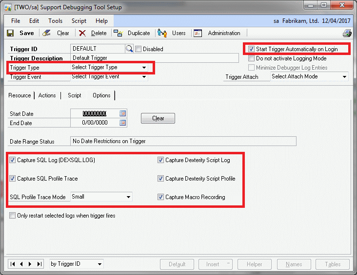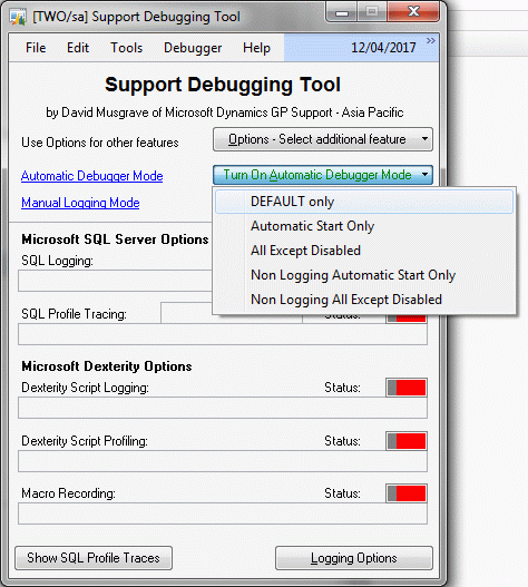 If you would like Manual Logging Mode to start automatically after logging into Microsoft Dynamics GP, you can achieve this by using an Automatic Debugger Mode trigger. Select Options >> Setup Automatic Debugger Mode from the Support Debugging Tool main window.