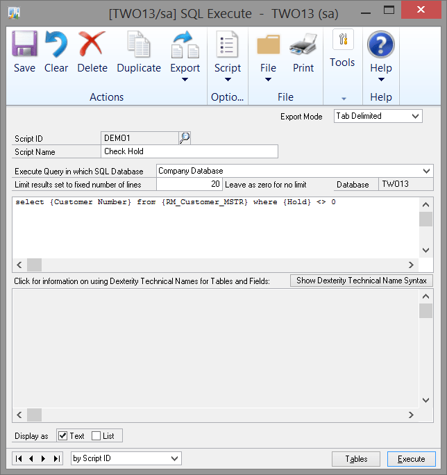 • You can use Dexterity Technical Names in your queries if they are surrounded by braces { } and SQL Execute will convert them to physical table and column names before execution for you.