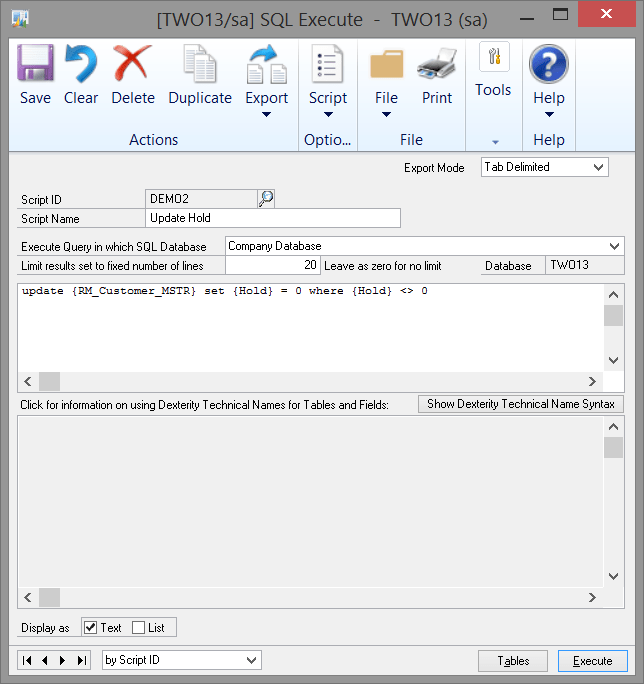 [code language=”sql”]update {RM_Customer_MSTR} set {Hold} = 0 where {Hold} <> 0[/code]