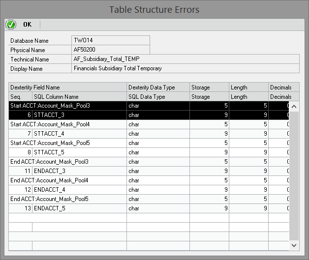 Database Validation can also be used to identify SQL tables and views which don’t appear to be used by any of the installed product dictionaries as well as Dexterity table definitions for which the SQL table or view has not been created. For tables that exist in both the Dexterity product dictionaries and in SQL, Database Validation can compare the tables structures to ensure that the columns and datatypes match.