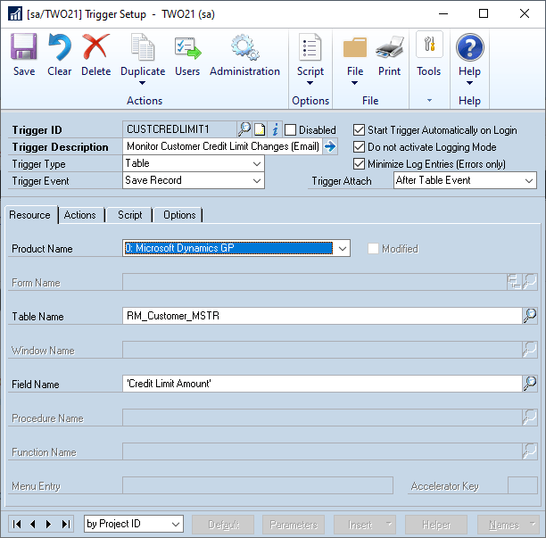 The event used for all three triggers is the table save event for the RM_Customer_MSTR (RM00101) table specifying the Credit Limit Amount field. GP Power Tools will track the previous value of the field so the code in the trigger can tell if the field has been changed when it is saved.
