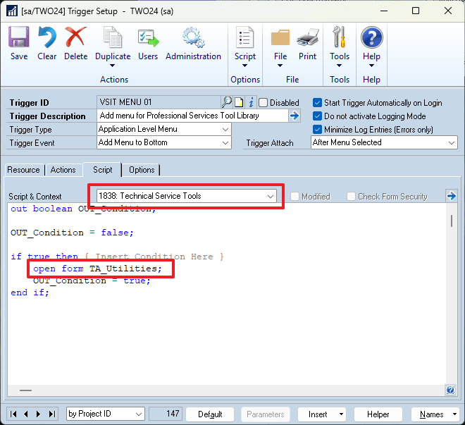 On the Resource Tab, use the lookup to select Product Name: 1838: Technical Service Tools, and under Project Series Form Name: TA_Utilities, Window Name: TA_Utility_Options.